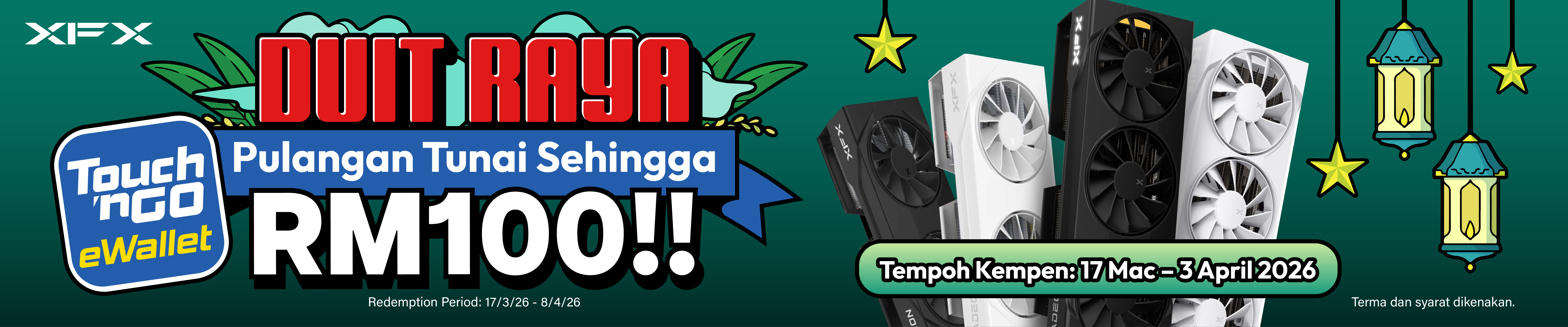 Purchase selected XFX AMD Radeon RX 9060 XT / 9070 XT Series Graphics Cards during the campaign period and redeem Touch ’n Go (TNG) eWallet credits!